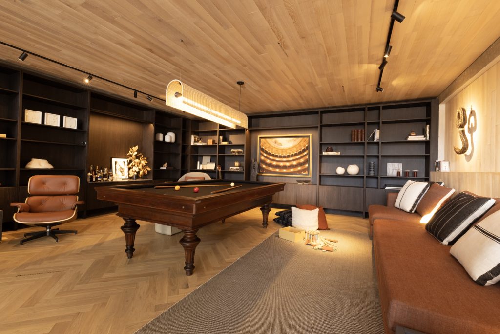 En ese contexto, la mesa de billar aparece como el eje organizador del espacio. A su alrededor, sillones y poltronas se disponen como si fueran butacas de estadio, configurando diferentes situaciones dentro de un mismo ambiente. Así, el espacio se fragmenta en pequeñas escenas que habilitan múltiples usos, desde la lectura hasta la conversación o el simple estar.