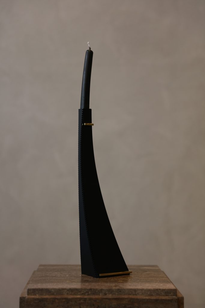En paralelo, presentó Pararrayos en Design Week México 2025, dentro de la exhibición Inédito. El candelabro, realizado en aluminio serie 5000, cobra forma con un simple pliegue manual. “El usuario completa el diseño con su gesto. Me interesa que el objeto lo involucre”, dice.