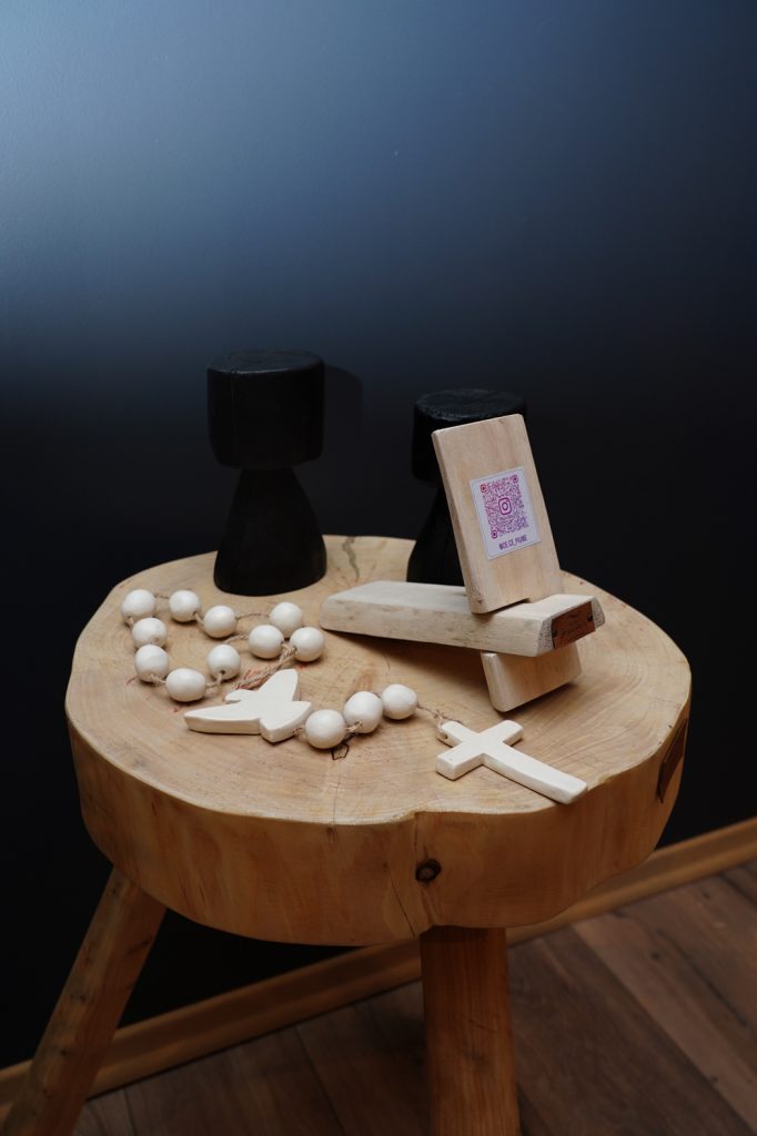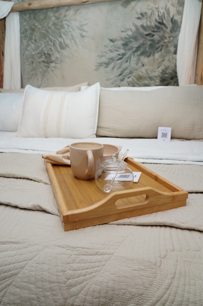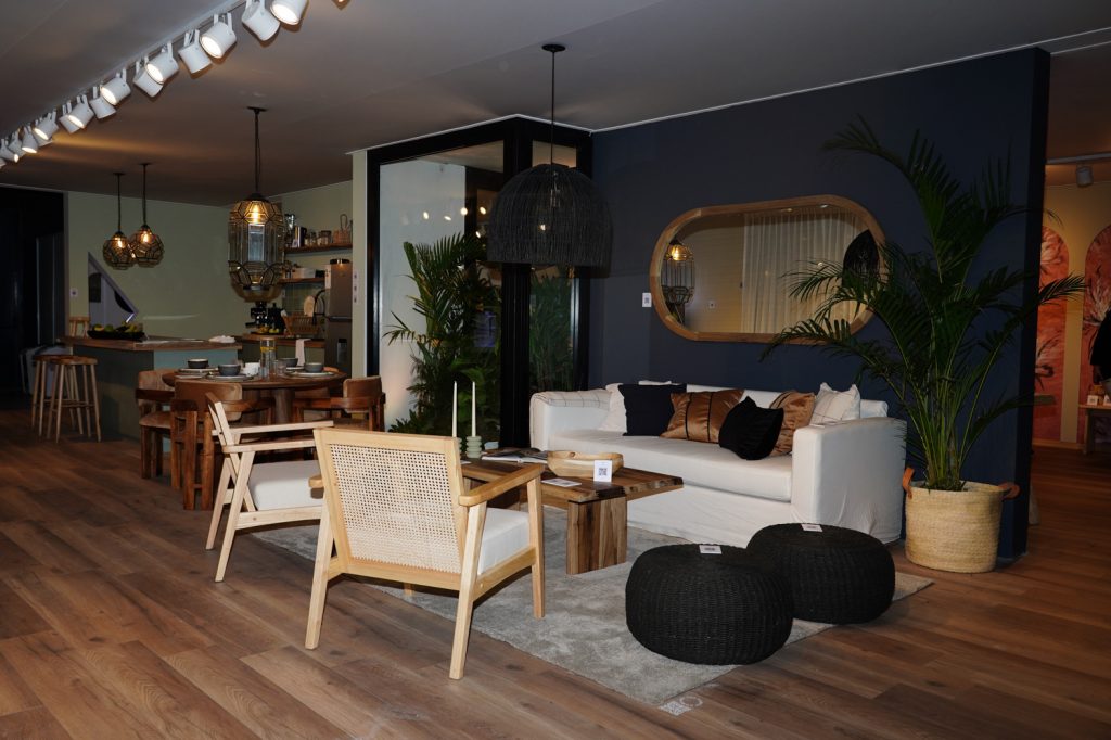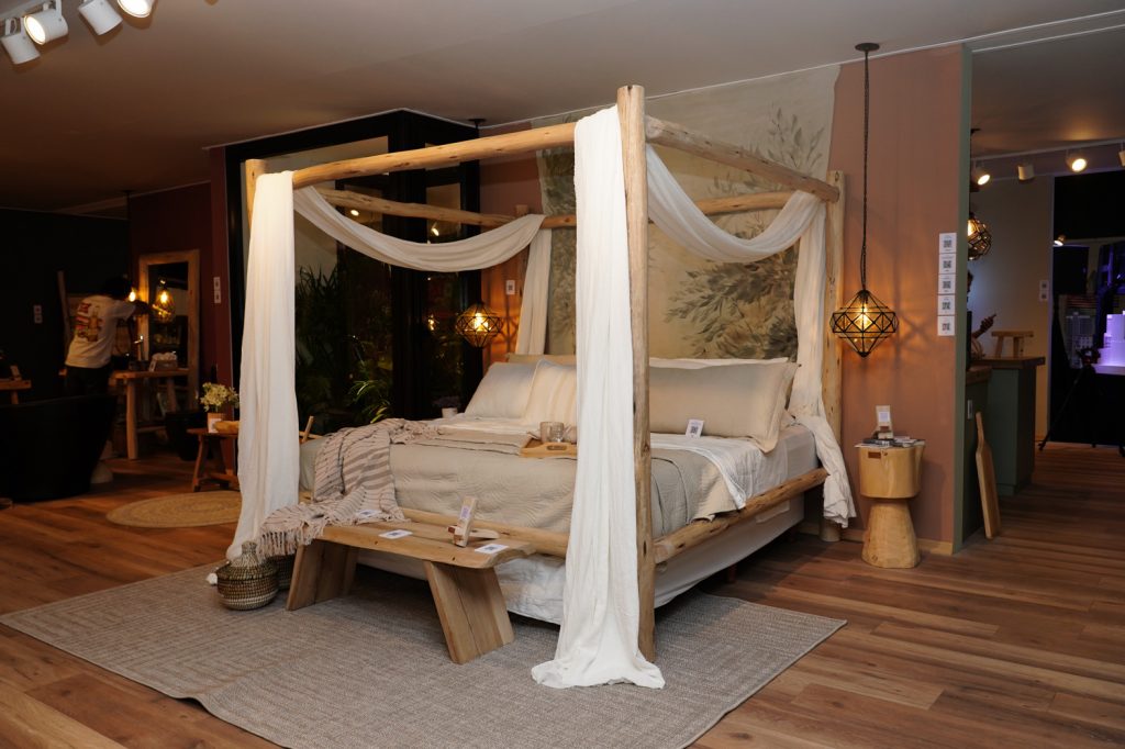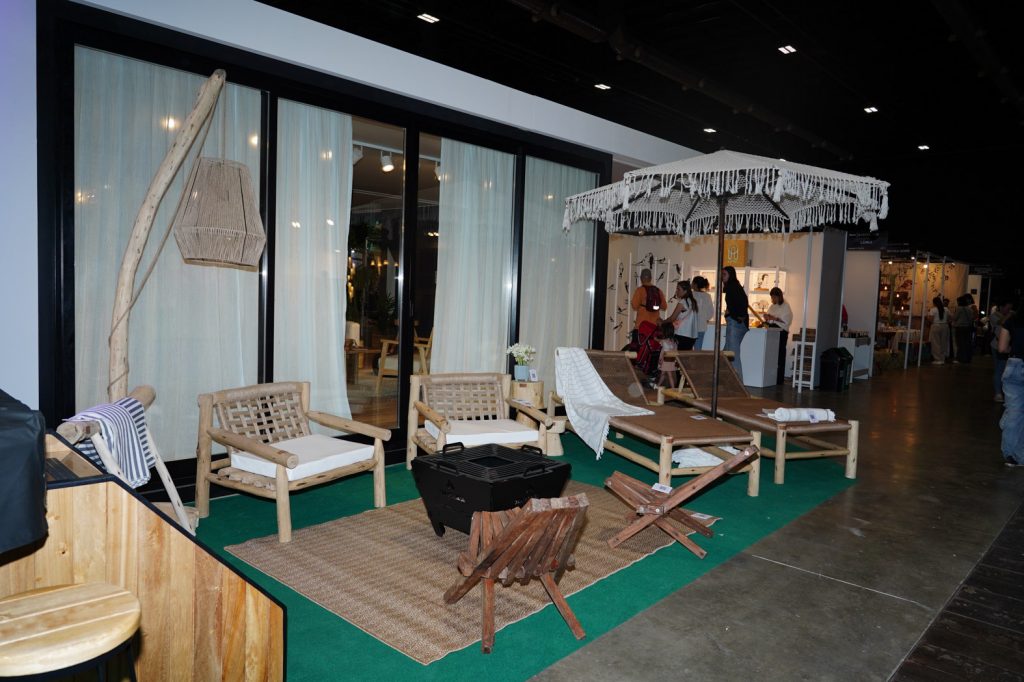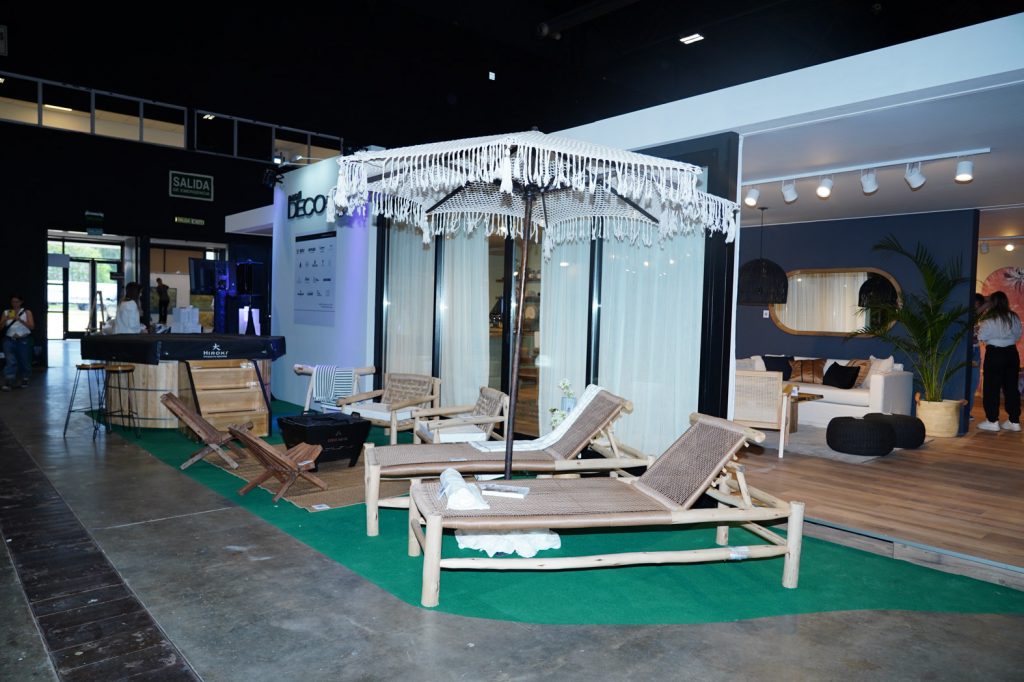En la ambientación, CeCé Piumé sumó mobiliario artesanal realizado con maderas recuperadas, fibras naturales y textiles reciclados. Cada pieza refleja una filosofía de diseño emocional, que transforma la materia en objetos con alma. Las lámparas tejidas, alfombras ecológicas y esculturas funcionales aportaron calidez, textura y un sentido de pertenencia único.
