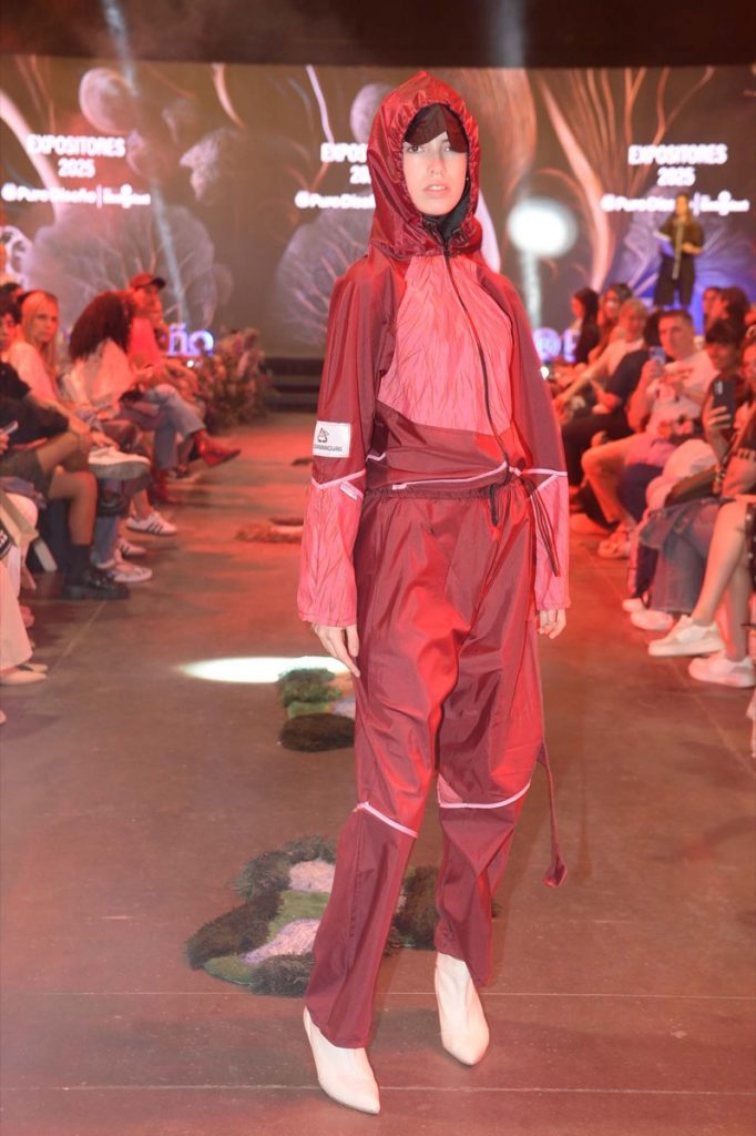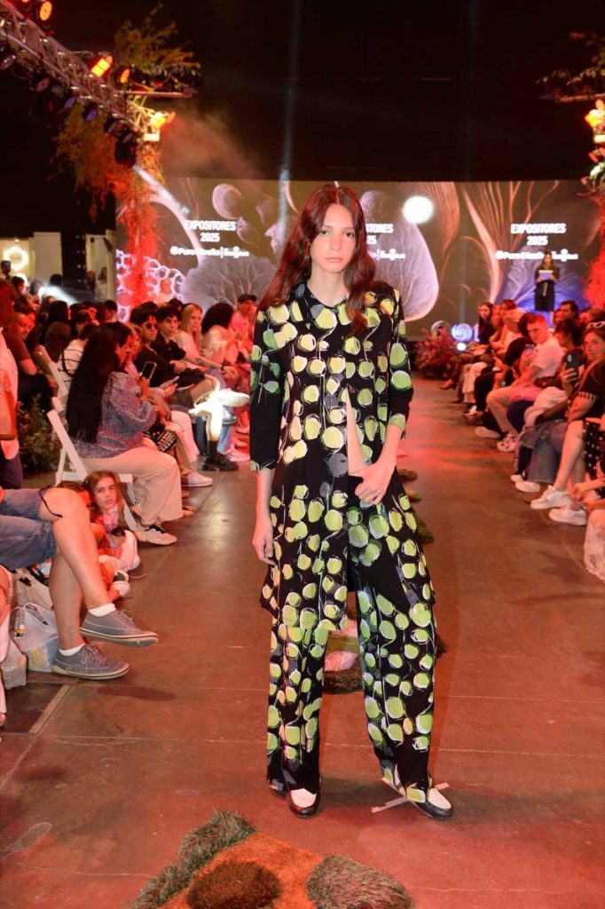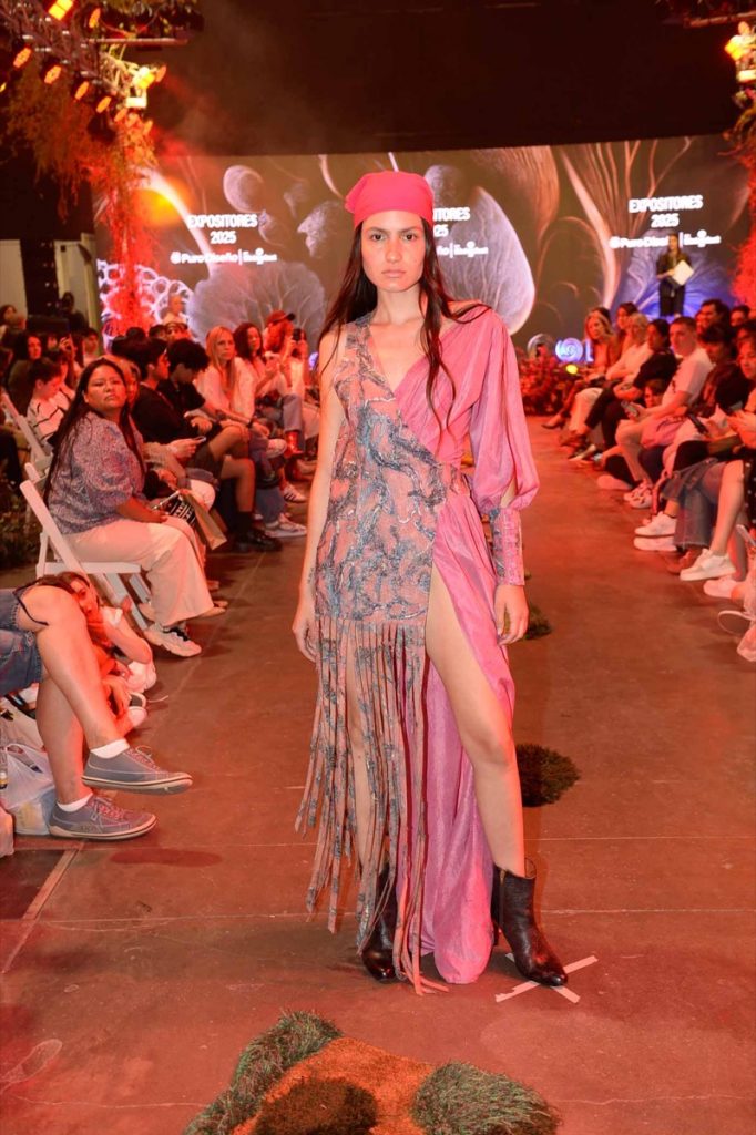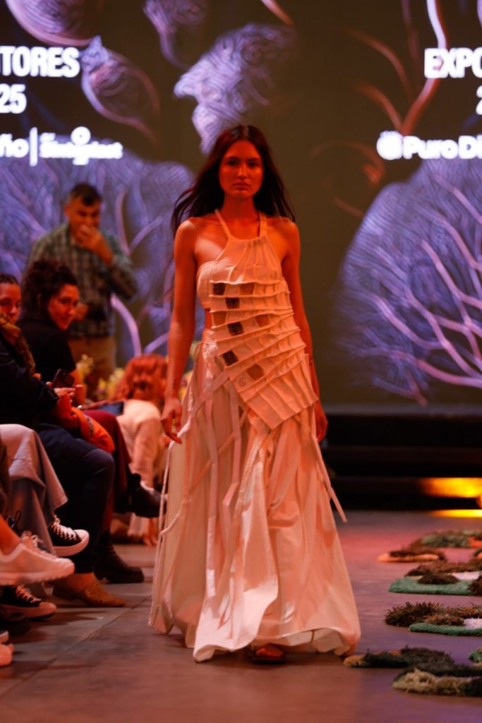 El desfile se completó con Rafne Studio, que mostró un vestido amplio de algodón natural con detalles de cuero gamuzado, y Sánchez Depino, que cerró la pasarela con prendas creadas a partir de descartes textiles, reafirmando la fuerza del diseño circular.