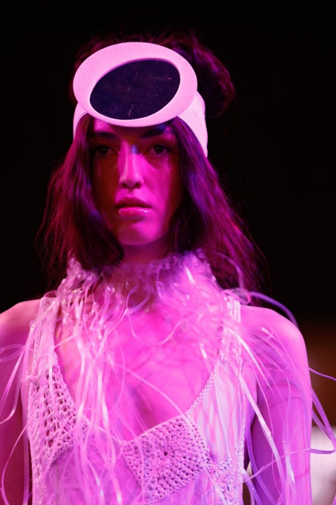 Paraíso Disruptivo llevó la experimentación al extremo con accesorios de bio cuero, cenizas e hilos de cobre esmaltados tejidos al crochet, mientras que Mahon presentó prendas y telas intervenidas con pinturas originales de su creadora, combinadas con anteojos artesanales de Chamana.