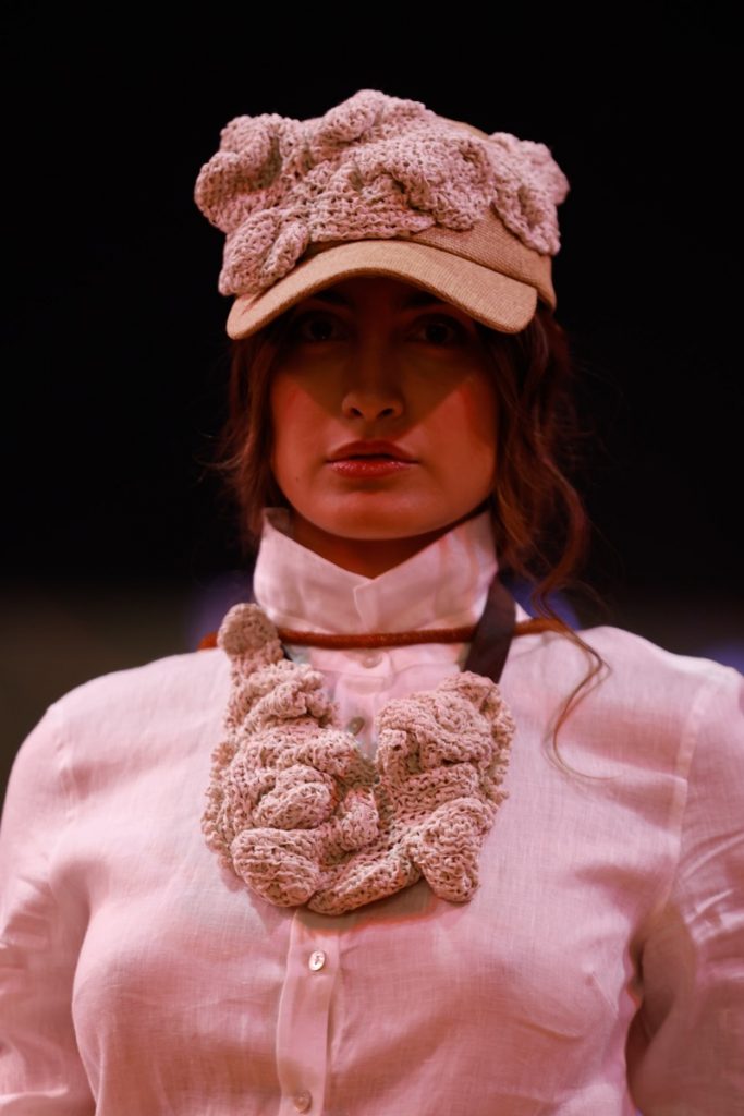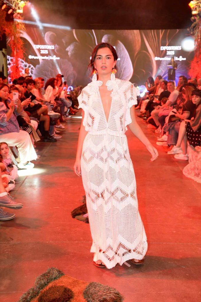 Desde San Antonio de Areco, Juana Diez presentó una colección de upcycling que une diseño y conciencia ambiental, mientras que Cosecha sorprendió con un vestido creado a partir de descartes de algodón y scrap de medias de nylon unidos a crochet.