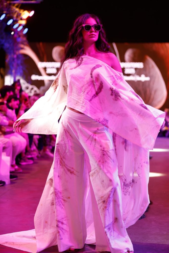 ADN Jewelry sorprendió con una capa hecha con 710 cápsulas de café recicladas, combinada con botas de Ruma Zapatos. La moda sustentable continuó con Palo Azul y sus zapatillas ABRA, teñidas con pigmentos naturales y confeccionadas con materiales reciclados.